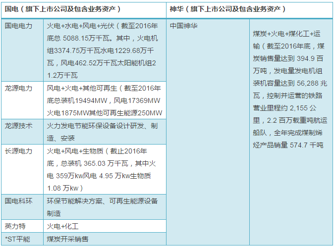 國電集團(tuán)旗下主要有國電電力、龍?jiān)措娏?、龍?jiān)醇夹g(shù)、長(zhǎng)源電力、國電科環(huán)、英力特、*ST平能等幾家上市公司,神華集團(tuán)旗下主要有中國神華一家。