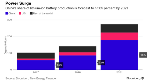 根據(jù)某媒體新能源財經(jīng)發(fā)布的數(shù)據(jù),目前,全球大約55%的鋰離子電池生產(chǎn)產(chǎn)能集中在中國,10%集中在美國。而到2021年前,中國的份額預(yù)計將增長到65%。