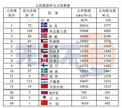 人均能源消費(fèi)量和人均耗電量在一定程度上反映一個國家或地區(qū)經(jīng)濟(jì)發(fā)展水平和人民生活水平。本數(shù)據(jù)來自維基百科,人均能源消費(fèi)量和人均耗電量最多的國家是冰島和列支敦士登。雖然中國電力產(chǎn)量居世界首位,但人均量居世界第64位。