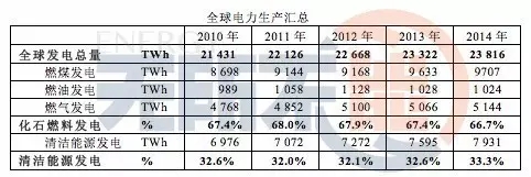 化石燃料發(fā)電以燃煤發(fā)電為主,其次是燃?xì)獍l(fā)電。2010年化石燃料發(fā)電占全球發(fā)電總量的67.4%,到2014年仍然保持在66.7%,但有所回落;而清潔能源發(fā)電逐年上升。