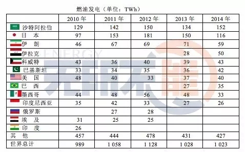 燃油發(fā)電占化石燃料發(fā)電份額較少,2014年僅占全球發(fā)電總量的1204/23816= 5.1%。燃油發(fā)電最多的國家是沙特阿拉伯,占燃油發(fā)電總量的152/1023= 14.9%,其次是日本,占116/1023= 11.3%。
