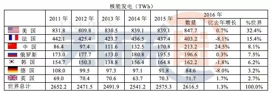 根據(jù)《BP世界能源統(tǒng)計(jì)年2017年6月》的報告,全球核能發(fā)電在逐步增長,2016年增長了1.3%,其中中國排序?yàn)槿虻谌?,次于美國和法國,但是發(fā)展最快,2016年增長24.5%。德國逐年減少,2016年減少了8%,盡管日本核能發(fā)電有所抬頭,但力道很小,僅占全球總量的0.7%。