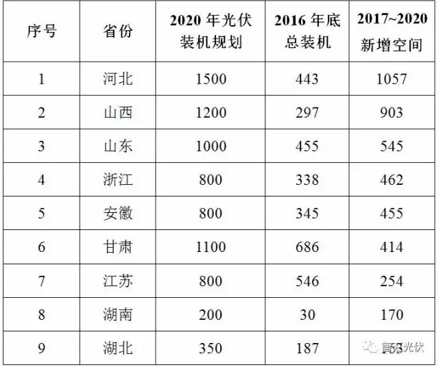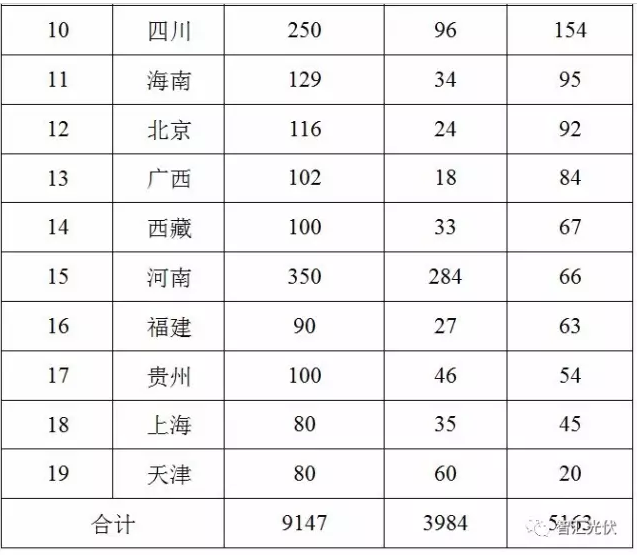 表:全國各省“十三五”光伏規(guī)劃容量統(tǒng)計(單位:萬kW)