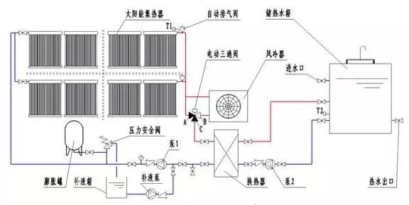 空冷器在太陽能系統(tǒng)中的運行原理:①當溫度T1<95℃時,電動三通閥A口和C口相通,B口關閉,太陽能集熱系統(tǒng)運行處于集熱工作狀態(tài);②當溫度T1≥95℃時,電動三通閥A口關閉,B口和C口相通,同事風冷器啟動,太陽能集熱系統(tǒng)系統(tǒng)運行處于散熱降溫工作狀態(tài),直至溫度T1<95℃,恢復①的運行工作狀態(tài)。