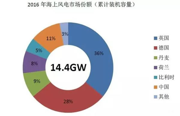 2016年,全球海上風(fēng)電裝機(jī)達(dá)到14.4GW,其中歐洲占據(jù)了其中的87%,尤以英國(guó)、德國(guó)、丹麥、荷蘭、比利時(shí)五國(guó),下文的主要分析對(duì)象,即針對(duì)以上五國(guó)。
