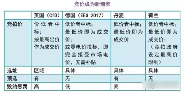 目前,采用競(jìng)拍的方式?jīng)Q定上網(wǎng)電價(jià)正在成為趨勢(shì),英國(guó)、德國(guó)、荷蘭都開始改成這種形式,與中國(guó)最初推行海上風(fēng)電時(shí)實(shí)施的特許經(jīng)營(yíng)權(quán)有些類似。這種模式下產(chǎn)生的價(jià)格由競(jìng)爭(zhēng)產(chǎn)生,更利于海上風(fēng)電價(jià)格下降,但對(duì)于企業(yè)而言風(fēng)險(xiǎn)較大,更適宜較為成熟的市場(chǎng),無(wú)論是供應(yīng)鏈還是玩家的風(fēng)險(xiǎn)掌控能力都更強(qiáng)。