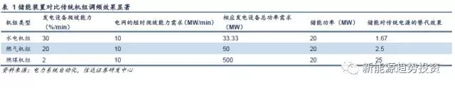 儲(chǔ)能對(duì)傳統(tǒng)電源的調(diào)頻替代作用是非常顯著的。我們假設(shè)區(qū)域電網(wǎng)在2min內(nèi)有20MW的升功率需求,即對(duì)系統(tǒng)整體的爬坡能力要求為10MW/min。傳統(tǒng)火電機(jī)組的爬坡率在2%~5%,我們假設(shè)火電機(jī)組爬坡率為2%/min,則需要一臺(tái)容量為500MW的火電機(jī)組來(lái)提供調(diào)節(jié),而采用20MW的儲(chǔ)能系統(tǒng)就能夠瞬間完成升功率的需求,即在該調(diào)節(jié)速率需求下,1MW儲(chǔ)能系統(tǒng)提供的AGC調(diào)頻能力相當(dāng)于25MW火電機(jī)組的調(diào)節(jié)能力。如果系統(tǒng)的功率調(diào)節(jié)需求為20MW/min ,則儲(chǔ)能的調(diào)節(jié)功率替代效果是燃煤機(jī)組的50倍。PNNL同過(guò)仿真得到類似的結(jié)論,根據(jù)California電力市場(chǎng)的電源特點(diǎn),平均來(lái)看,儲(chǔ)能調(diào)頻效果是水電機(jī)組的1.7倍,燃?xì)鈾C(jī)組的2.5倍,燃煤機(jī)組的20倍以上。