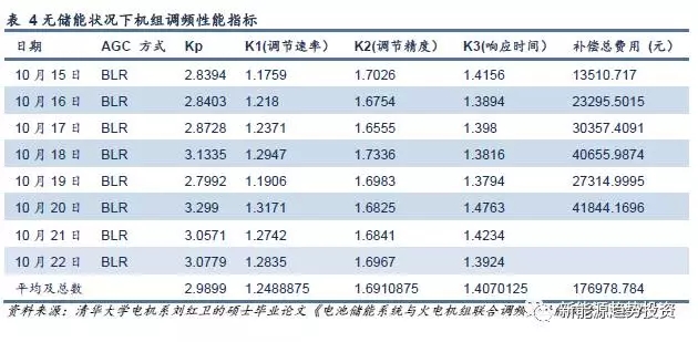 由于目前國(guó)內(nèi)對(duì)儲(chǔ)能調(diào)頻效果及經(jīng)濟(jì)性的測(cè)算缺乏統(tǒng)一標(biāo)準(zhǔn),因此根據(jù)清華大學(xué)電機(jī)系劉紅衛(wèi)的碩士畢業(yè)論文《電池儲(chǔ)能系統(tǒng)與火電機(jī)組聯(lián)合調(diào)頻的性能及經(jīng)濟(jì)性分析》中石景山的項(xiàng)目數(shù)據(jù),我們得到儲(chǔ)能和火電機(jī)組聯(lián)合調(diào)頻的效果及經(jīng)濟(jì)性相關(guān)評(píng)價(jià)。