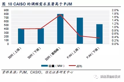 實(shí)際上隨著新能源的占比的不斷上升,實(shí)際需求還將會(huì)更高。以加州為例,由于風(fēng)光的大量接入,2016年CAISO增加了2月~6月調(diào)頻需求量(一般增加到600MW,在2月底~3月初增加到800MW),總需求量是同期的近兩倍,而這段時(shí)間內(nèi)的調(diào)節(jié)成本同比上漲了6倍,這體現(xiàn)了調(diào)頻巨大的經(jīng)濟(jì)效益。2016年加州總裝機(jī)量達(dá)7902.6萬(wàn)千瓦,其中風(fēng)電占比7.1%,太陽(yáng)能占比12.5%,相比之下PJM總裝機(jī)量達(dá)1.82億千瓦,而風(fēng)電只占0.6%,太陽(yáng)能占比只有0.1%。反應(yīng)在調(diào)頻需求上加州的調(diào)頻需求是峰值容量的0.9%,最高峰時(shí)可達(dá)1.7%,而PJM只有0.3%~0.5%。