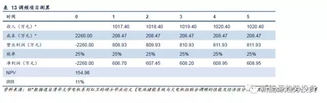 調(diào)頻經(jīng)濟(jì)性遠(yuǎn)好于削峰填谷。因此根據(jù)清華大學(xué)電機(jī)系劉紅衛(wèi)的碩士畢業(yè)論文《電池儲(chǔ)能系統(tǒng)與火電機(jī)組聯(lián)合調(diào)頻的性能及經(jīng)濟(jì)性分析》中石景山的項(xiàng)目數(shù)據(jù),我們得到儲(chǔ)能和火電機(jī)組聯(lián)合調(diào)頻的效果及經(jīng)濟(jì)性相關(guān)評(píng)價(jià)。石景山項(xiàng)目總投資2260萬(wàn)元,其中電池為1200萬(wàn)元,PCS為600萬(wàn)元,施工費(fèi)用460萬(wàn)元,我們假設(shè)設(shè)備殘值為5%,根據(jù)以上假設(shè)我們進(jìn)行投資回收期測(cè)算,在第5年時(shí)NPV即可為正,IRR可達(dá)到11%,體現(xiàn)了調(diào)頻項(xiàng)目具有非常好的投資前景。由此我們可以看出調(diào)頻的經(jīng)濟(jì)性遠(yuǎn)超削峰填谷,而未來(lái)隨著新能源在電源中占比的進(jìn)一步提高,以及電力市場(chǎng)進(jìn)一步深化,開(kāi)放輔助服務(wù)市場(chǎng),調(diào)頻的需求也將進(jìn)一步釋放,因此我們認(rèn)為調(diào)頻將會(huì)成為一個(gè)競(jìng)爭(zhēng)激烈的市場(chǎng)。此外還可以將同一儲(chǔ)能應(yīng)用到不同的場(chǎng)景中,通過(guò)多種場(chǎng)景疊加來(lái)獲得更多的收益,從而進(jìn)一步縮短投資回收期。