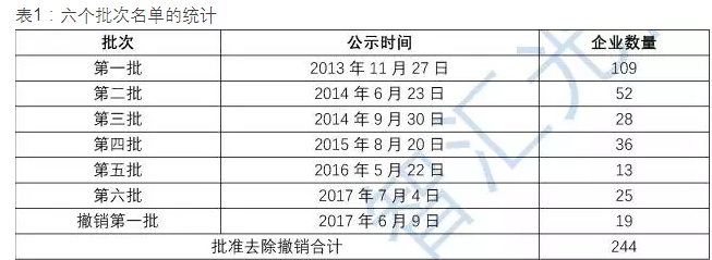 之前,工信部已經(jīng)公布了五批符合要求的企業(yè),并在今年根據(jù)后期的復(fù)查情況撤銷了一批企業(yè)。六批企業(yè)累計263家,撤銷19家,如今剩余名單內(nèi)企業(yè)共244家,如下表所示。