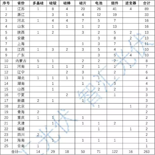 上述六個批次、263家企業(yè),涵蓋光伏產(chǎn)業(yè)上、中游7個環(huán)節(jié),分布在25個省、市、自治區(qū),主要集中在長三角地區(qū)(江蘇、浙江、上海),這一地區(qū)也是我國分布式光伏項目集中的區(qū)域。具體分布情況如表2所示。