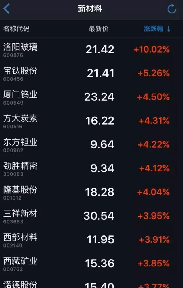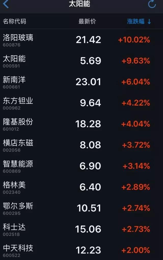 首先我們來(lái)看看隆基所處的幾個(gè)板塊漲幅:新材料和太陽(yáng)能領(lǐng)域,上漲4%以上的公司不是太多,隆基排在前六。