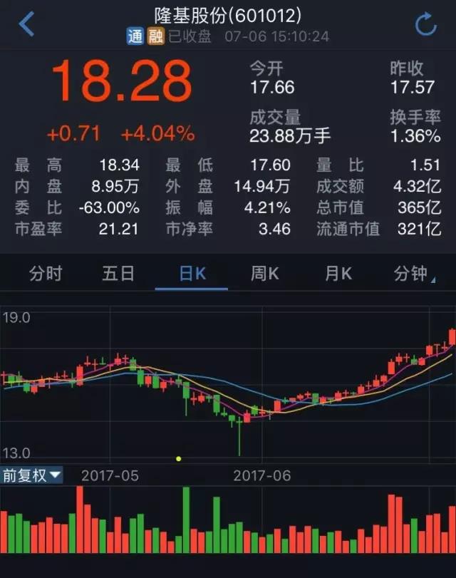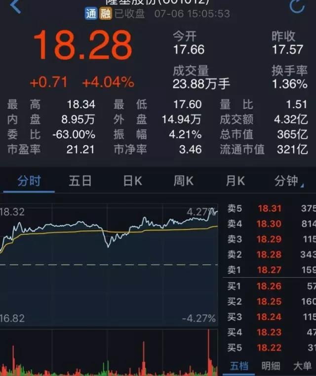 今日晨間,隆基股份以17.66元的價(jià)格開(kāi)門(mén)迎客,此后很快沖高至18.32元,隨后中途有點(diǎn)下滑,但截至下午收盤(pán)時(shí),它以全天的較高價(jià)18.28元收官。