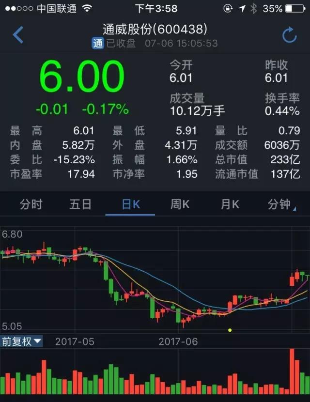 隨著2016年隆基旗下的新組件公司---樂(lè)葉光伏業(yè)績(jī)的逐步顯現(xiàn),這家優(yōu)質(zhì)單晶硅一體化企業(yè)的高潮也漸漸出現(xiàn)。需要注意的是,目前隆基股份的股價(jià)近幾個(gè)月來(lái)處于高位,投資者在短期內(nèi)應(yīng)注意投資風(fēng)險(xiǎn)。(下圖為日K線)