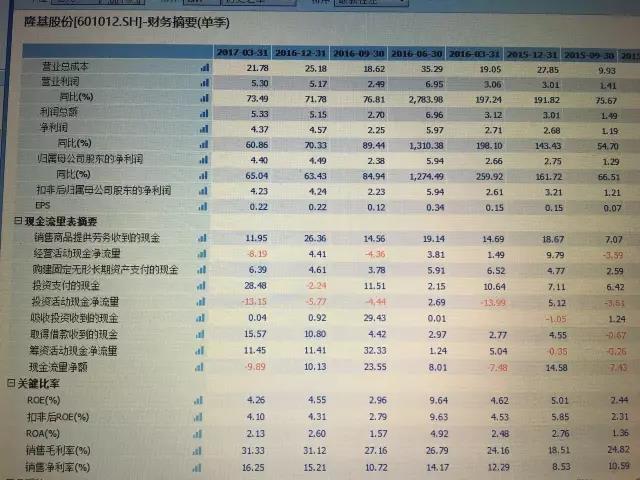 前圖的數(shù)字中也能發(fā)現(xiàn),“銷(xiāo)售商品提供勞務(wù)收到的現(xiàn)金”這一欄里,隆基的現(xiàn)金獲取穩(wěn)定,2016年第一季度~2017年第一季度的數(shù)字分別是:近15億、19.14億、14.56億、26.36億和11.95億。