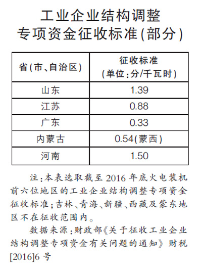 以華電章丘電廠為例。記者了解到,該電廠燃煤發(fā)電上網(wǎng)電價為0.35元/千瓦時左右,因其較早完成超低排放改造試點工作,獲批1分/千瓦時的超低排放電價。此外,脫硫、脫硝、除塵電價總計2.52分/千瓦時。相應(yīng)的,山東省內(nèi)工業(yè)企業(yè)結(jié)構(gòu)調(diào)整專項資金征收標(biāo)準為1.39分/千瓦時。