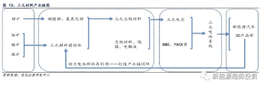 三元電池與其他鋰電池的主要區(qū)別在于正極材料的使用。三元電池以三元材料為正極材料,相應(yīng)的也需要負(fù)極、隔膜和電解液共同配合改進(jìn)來(lái)適應(yīng)新的材料體系,以達(dá)到最佳效果。目前業(yè)已形成從上游金屬礦到下游新能源汽車、3C等領(lǐng)域應(yīng)用的完整產(chǎn)業(yè)鏈。