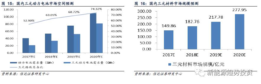 根據(jù)三元滲透率以及相關(guān)動(dòng)力電池行業(yè)情況,我們預(yù)計(jì)2017年國(guó)內(nèi)三元?jiǎng)恿﹄姵匦枨笤?2GWh左右,2020年,達(dá)到82GWh,2017-2020年復(fù)合增長(zhǎng)率達(dá)56%,對(duì)應(yīng)動(dòng)力領(lǐng)域三元材料需求約為4.3萬(wàn)噸和16.4萬(wàn)噸,考慮到三元價(jià)格變動(dòng)趨勢(shì),我們預(yù)計(jì)動(dòng)力領(lǐng)域三元材料市場(chǎng)規(guī)模2017年達(dá)82億元,2020年達(dá)228億元;三元材料整體市場(chǎng)規(guī)模2017年接近150億元,2020年超過(guò)320億元。