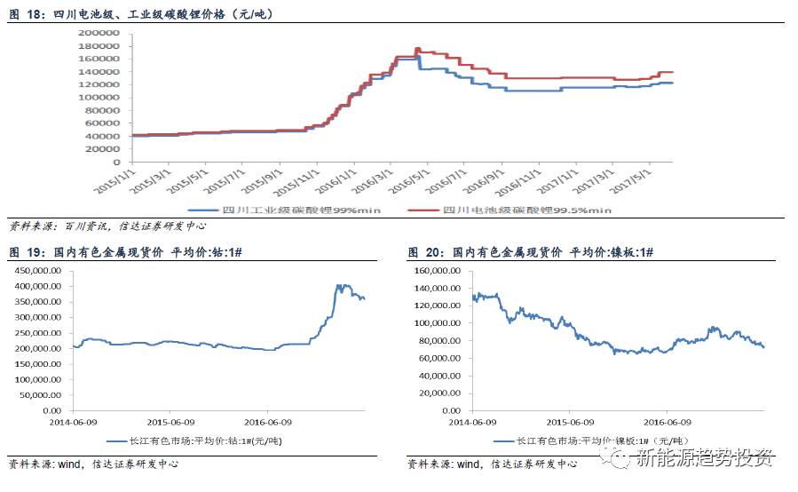 上游原材料情況:鋰鈷價(jià)格維持堅(jiān)挺,將推動(dòng)回收環(huán)節(jié)發(fā)展。上游鋰鈷資源有限,原料供給偏緊。在新能源汽車快速發(fā)展的帶動(dòng)下,電池級(jí)碳酸鋰和電池級(jí)氫氧化鋰的需求不斷攀升;我們預(yù)計(jì)鋰價(jià)將保持強(qiáng)勢(shì)。鈷價(jià)大漲后一直維持高位,后期隨著下游需求提升,特別是三元占比的提升,我們預(yù)計(jì)鈷價(jià)仍將維持堅(jiān)挺態(tài)勢(shì)。未來(lái)隨著動(dòng)力電池回收環(huán)節(jié)的壯大、完全循環(huán)經(jīng)濟(jì)體系的建立,價(jià)格有望回歸合理區(qū)間;時(shí)間上展望,這估計(jì)是2、3年后的事情,此情景有望在2019年展現(xiàn)。