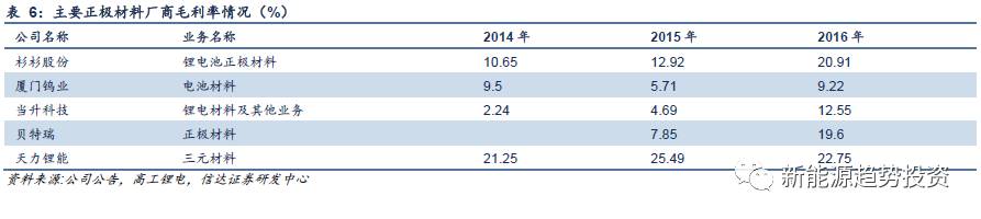 鈷價(jià)上漲意味著下游需求的上漲。國(guó)內(nèi)正極材料廠商主要采取加成定價(jià)模式,在原材料成本的基礎(chǔ)上增加利潤(rùn)與加工費(fèi),目前正極材料產(chǎn)品整體的毛利率在10%左右。正極材料廠商有著較為穩(wěn)健的成本上升的傳導(dǎo)機(jī)制,注意到鈷價(jià)穩(wěn)定上漲意味著產(chǎn)業(yè)鏈需求較好,會(huì)利好成本加成型行業(yè),隨著鈷價(jià)上漲企業(yè)毛利率有上揚(yáng)態(tài)勢(shì):2015年與2016年三元電池需求上漲,三元材料廠商毛利率總體來(lái)看呈上升趨勢(shì)。但是也要關(guān)注原材料價(jià)格走高會(huì)一定程度上壓縮產(chǎn)業(yè)鏈利潤(rùn)。