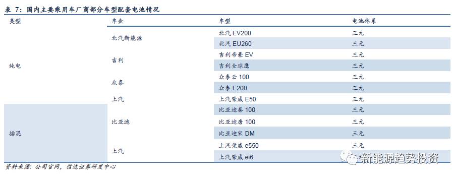 目前已有多家國(guó)內(nèi)主要汽車廠商為不同車型配套三元電池,三元的應(yīng)用越來(lái)越廣闊。