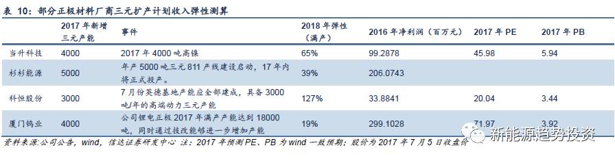我們對(duì)部分正極材料公司2017年三元材料擴(kuò)產(chǎn)情況進(jìn)行了收入彈性測(cè)算,可以看到,到2018年,各個(gè)企業(yè)擴(kuò)產(chǎn)計(jì)劃對(duì)該企業(yè)凈利有著顯著的正影響。