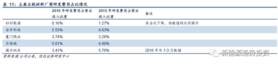 由于三元材料、尤其是高鎳三元材料技術(shù)壁壘較高,各個(gè)正極材料廠商紛紛加大研發(fā)投入,努力搶占技術(shù)高地。2016年,企業(yè)研發(fā)占比多有所提升。