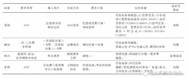 美國實時AGC競價市場從準(zhǔn)入到定價及結(jié)算均引入性能指標(biāo),對不同調(diào)頻源的適用性較廣。德國調(diào)頻市場的投標(biāo)競價未限制電源種類,準(zhǔn)入條件對容量受限型儲能有所制約,同時補償機制中效果指標(biāo)的缺位容易造成儲能與傳統(tǒng)源的收益分配與實際貢獻不對等。英國儲能調(diào)頻則處于前期驗證階段,尚未配套市場規(guī)則。國內(nèi)則已明確儲能在發(fā)電與需求兩側(cè)的調(diào)頻市場主體地位及價格機制的初步規(guī)則,但缺少適用于儲能的服務(wù)計量方法,調(diào)度機構(gòu)則缺乏電儲能裝置作為獨立可控設(shè)備參與AGC調(diào)頻的調(diào)度經(jīng)驗。表2為儲能調(diào)頻相關(guān)市場規(guī)則比較。