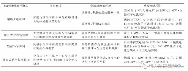 儲能作為主體參與商業(yè)調(diào)頻在美國因其市場環(huán)境發(fā)展而趨于完善且運行模式全面,德國、英國則因其強制性平衡機制助力儲能調(diào)頻在發(fā)電端與傳統(tǒng)機組相結(jié)合。其他歐洲國家受能源結(jié)構(gòu)變革驅(qū)動,為在穩(wěn)定電網(wǎng)運行前提下消納高比例新能源而引導(dǎo)儲能參與調(diào)頻。國內(nèi)則開展除需求側(cè)外的三種運行模式下儲能調(diào)頻項目,處于示范性或初級商業(yè)階段。儲能調(diào)頻不同運行模式的技術(shù)要求、市場或政策環(huán)境、典型項目如表1所示。