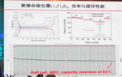 對于鈦酸鋰電池的缺點(diǎn),專家們提出了很多改進(jìn)方案。復(fù)旦大學(xué)夏永姚教授提出用離子摻雜和碳包覆的方法提高電子電導(dǎo)率;用表面處理和采用SEI膜電解液添加劑的方法改進(jìn)電池產(chǎn)氣問題。除這兩種方法之外,中科院物理所的胡勇勝教授還提出用表面氮化的方法。胡教授通過實(shí)驗(yàn)證明,氮摻雜包覆可增強(qiáng)Li4Ti5O12的表面穩(wěn)定性與導(dǎo)電性,因?yàn)槠浔砻嫘纬蒚i-N-C,有助于電荷的轉(zhuǎn)移;構(gòu)筑的三維混合導(dǎo)電網(wǎng)絡(luò)提升了Li在電極中的脫嵌速率。