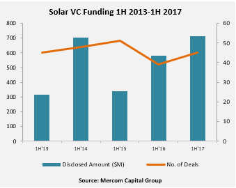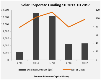 中國儲能網(wǎng)訊:Mercom資本集團日前發(fā)布半年度太陽能行業(yè)報告稱,2017年上半年,太陽能企業(yè)融資(包括風(fēng)投資金、公共市場和債務(wù)融資)小幅上升2.2%至46億美元,累計交易97個,去年同期為79個。