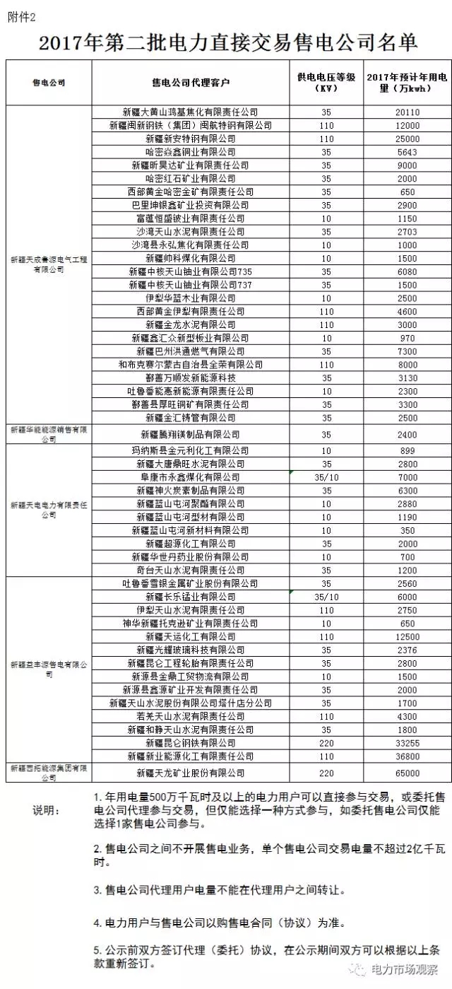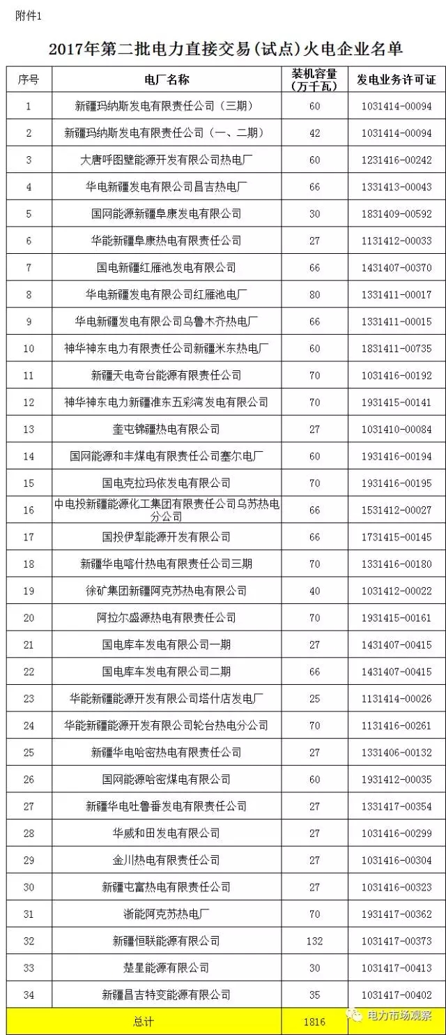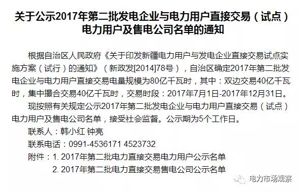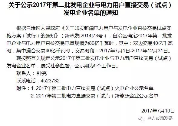 7月12日,新疆經(jīng)信委又發(fā)布了《關(guān)于公示2017年第二批發(fā)電企業(yè)與電力用戶直接交易(試點)發(fā)電企業(yè)名單的通知》。