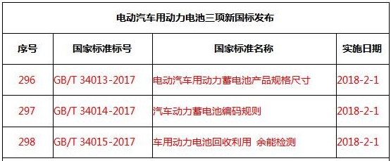本次GB/T 34013-2017《電動(dòng)汽車用動(dòng)力蓄電池產(chǎn)品規(guī)格尺寸》、GB/T 34014-2017《汽車動(dòng)力蓄電池編碼規(guī)則》、GB/T 34015-2017《車用動(dòng)力電池回收利用 余能檢測(cè)》三項(xiàng)國(guó)家標(biāo)準(zhǔn)發(fā)布,使動(dòng)力電池產(chǎn)品規(guī)格尺寸、編碼規(guī)則和回收利用余能檢測(cè)有標(biāo)準(zhǔn)可依,對(duì)動(dòng)力電池行業(yè)規(guī)范發(fā)展具有重要意義,對(duì)動(dòng)力電池企業(yè)乃至新能源汽車產(chǎn)業(yè)都將產(chǎn)生影響。