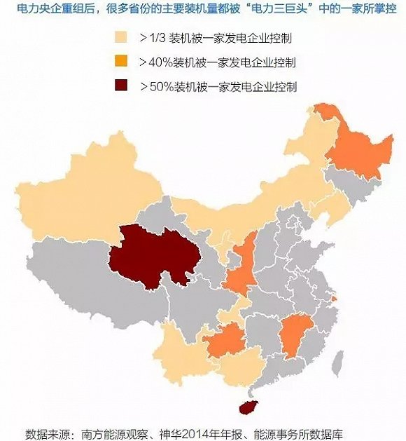 然而,如果我們把視角下沉,從省一級(jí)別的角度去看待這場(chǎng)重組,就可以發(fā)現(xiàn),在一些省份,由發(fā)電央企重組而產(chǎn)生的三巨頭,將會(huì)對(duì)電力市場(chǎng)產(chǎn)生超出預(yù)期的影響。