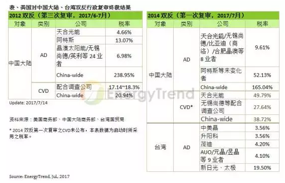 美國對兩岸的光伏雙反調(diào)查共分為五個案號,分別為2012年對中國大陸的反傾銷與反補貼、2014年對中國大陸的反傾銷與反補貼、以及2014年對臺灣的反傾銷,并且分別在不同的行政復(fù)審階段。目前根據(jù)中、臺、美三方官方單位所發(fā)布的消息,已經(jīng)確定終裁的行政復(fù)審結(jié)果如下: