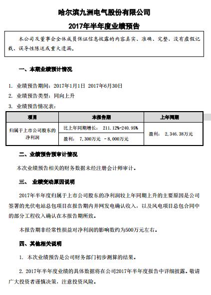 中國儲能網(wǎng)訊:北極星風力發(fā)電網(wǎng)獲悉,九洲電氣近日發(fā)布預告稱2017年上半年預計盈利7300-8000 萬元,主要原因是公司簽署的光伏電站總包項目在報告期內(nèi)并網(wǎng)發(fā)電確認收入,以及風電項目總包合同中的部分工程收入確認在本報告期所致。以下為預告原文: