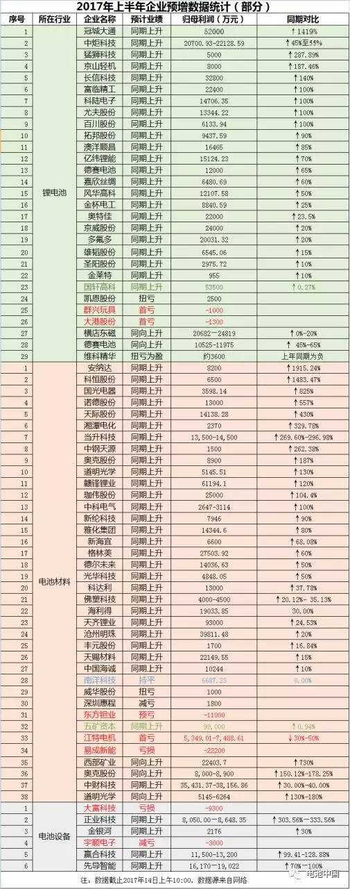 29家鋰電生產(chǎn)企業(yè)中,冠城大通預(yù)計(jì)2017年上半年業(yè)績(jī)同比增長(zhǎng)1419%,領(lǐng)跑鋰電生產(chǎn)企業(yè);大港股份和群興玩具則出現(xiàn)首次虧損,虧損額分別為1300萬元和1000萬元。38家鋰電材料生產(chǎn)企業(yè)中,安納達(dá)、科恒股份領(lǐng)跑材料企業(yè),南洋科技利潤(rùn)與上年同期持平,東方鉭業(yè)、江特電機(jī)、易成新能或出現(xiàn)不同程度的虧損。6家設(shè)備企業(yè)中,大富科技、宇順電子業(yè)績(jī)不佳,而正業(yè)科技漲幅最高,達(dá)約333%。