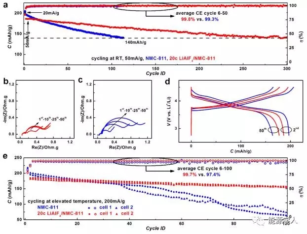 作者將LiAlF4薄膜直接沉積在極片上,而不是在每個顆粒表面。滿足了在寬電化學(xué)窗口下工作的要求。作者研究了在2.75-4.50V下,高Ni含量LiNi0.8Mn0.1Co0.1O2(NMC-811)上沉積的涂層效果。在室溫下,具有LiAlF4涂層的NMC-811電極在300次循環(huán)后維持高于140mAh/g的容量(超過300次循環(huán)衰減24%,每循環(huán)0.08%)。對于原始的NMC-811,113次循環(huán)后容量下降到低于140mAh/g(在113個循環(huán)中衰減29%,每個循環(huán)為0.26%)。由于高溫下的循環(huán)穩(wěn)定性差是高Ni含量層狀鋰金屬氧化物最為顯著的缺點。因此,作者對樣品進行了高溫環(huán)境(50℃)的電化學(xué)測試。由于在50℃下涂層和NMC-811本身的鋰離子傳導(dǎo)性都會提高,所以以20c的倍率測試。原始NMC-811電極的容量在100個循環(huán)內(nèi)快速衰減低于100 mAh/g。相比之下,具有ALD LiAlF4涂層的NMC-811電極在100個循環(huán)內(nèi)顯示出優(yōu)異的容量保持率。