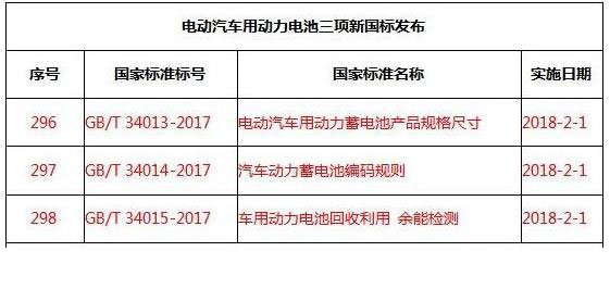 中國儲能網(wǎng)訊:日前,國家質(zhì)量監(jiān)督檢驗檢疫總局、國家標準化管理委員會批準發(fā)布了312項國家標準,其中涉及電動汽車用動力電池相關(guān)標準3項,分別為GB/T 34013-2017《電動汽車用動力蓄電池產(chǎn)品規(guī)格尺寸》、GB/T 34014-2017《汽車動力蓄電池編碼規(guī)則》、GB/T 34015-2017《車用動力電池回收利用 余能檢測》,3項標準將于2018年2月1日起實施。