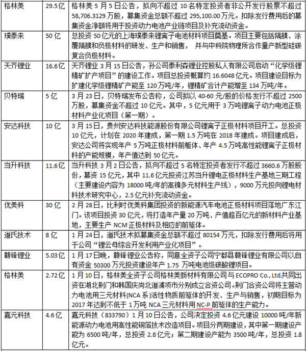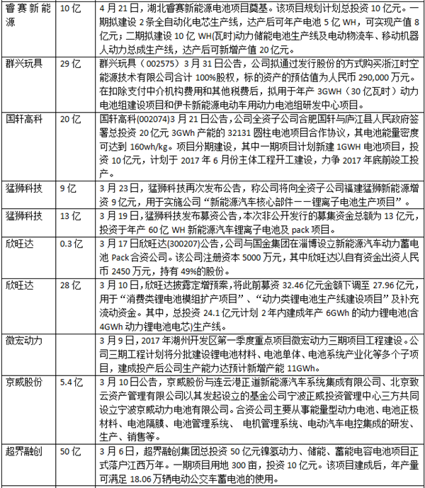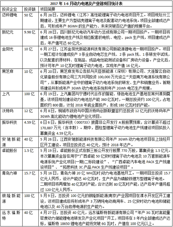 記者從2017年上市公司公告及公開報(bào)道中,不完全統(tǒng)計(jì)了2017年上半年動(dòng)力電池領(lǐng)域的投資情況,統(tǒng)計(jì)在內(nèi)的52個(gè)投資項(xiàng)目總投資額達(dá)到919.96億元。其中,動(dòng)力鋰電池項(xiàng)目有30個(gè),投資額達(dá)到676.27億元;正負(fù)極材料項(xiàng)目有16個(gè),投資額達(dá)183.19元;電解液及隔膜項(xiàng)目有6個(gè),投資額為60.5億元。
