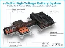 2015版e-Golf電池包是一個(gè)典型的“土”字形結(jié)構(gòu),充分利用了整車上可以利用的空間??傠娏繛?4.2kWh,總電壓為320V,容量為75Ah,電池包重量為313kg,體積為229.4 L。2016年起,大眾選用新的三元電芯,在原有體積不變的情況下,電池包的總電量達(dá)到35.8kWh,整車的續(xù)航里程也從134公里提升至200公里。
