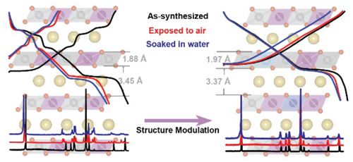 針對(duì)O3型層狀正極材料在空氣中自發(fā)地向貧鈉相轉(zhuǎn)變的空氣穩(wěn)定性差的問(wèn)題,研究人員提出Cu/Ti共摻雜的結(jié)構(gòu)優(yōu)化策略(如圖2所示)。通過(guò)合理地對(duì)NaNi0.5Mn0.5O2材料組成和結(jié)構(gòu)進(jìn)行調(diào)制,并結(jié)合密度泛函理論計(jì)算模擬及材料結(jié)構(gòu)-電化學(xué)實(shí)驗(yàn)證明,通過(guò)Cu/Ti共摻雜技術(shù)獲得的O3型NaNi0.45Cu0.05Mn0.4Ti0.1O2正極材料可成功地抑制鈉離子的自發(fā)脫出和材料的氧化,顯著提升了材料暴露在空氣中甚至浸泡在水中的結(jié)構(gòu)穩(wěn)定性和容量保持能力,降低了材料的儲(chǔ)存費(fèi)用,有力促進(jìn)了其實(shí)際應(yīng)用,這也為未來(lái)設(shè)計(jì)高性能鈉離子電池正極材料以及材料結(jié)構(gòu)優(yōu)化提供了科學(xué)的指導(dǎo)(J. Am. Chem. Soc. 2017, 139, 8440)。