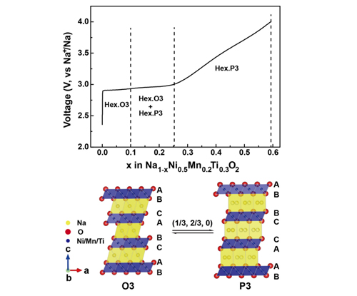 圖1 O3型NaNi0.5Mn0.2Ti0.3O2正極材料的充電曲線與結(jié)構(gòu)變化
