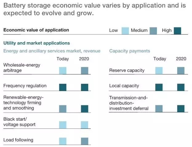 麥肯錫研究發(fā)現(xiàn),對(duì)于許多商業(yè)客戶(hù)來(lái)說(shuō),通過(guò)儲(chǔ)能設(shè)備來(lái)降低他們高峰時(shí)期的電力需求量已經(jīng)是經(jīng)濟(jì)可行的了。在現(xiàn)今電價(jià)較低的情況下,儲(chǔ)能開(kāi)始在能源市場(chǎng)上發(fā)揮更廣泛的作用,并從電網(wǎng)平衡等利基市場(chǎng)轉(zhuǎn)變?yōu)楦鼜V泛的應(yīng)用,如替代傳統(tǒng)發(fā)電機(jī)提高供電可靠性和穩(wěn)定性,支持可再生能源并網(wǎng)整合等。
