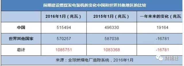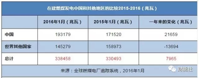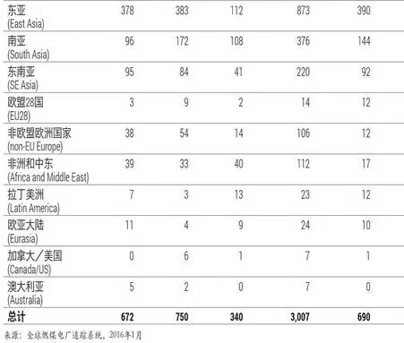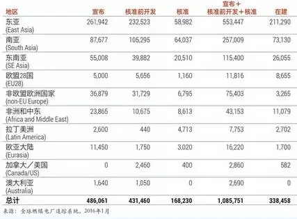 全球各地區(qū)燃煤發(fā)電裝機(jī)2016年1月(表一兆瓦+表二臺(tái))