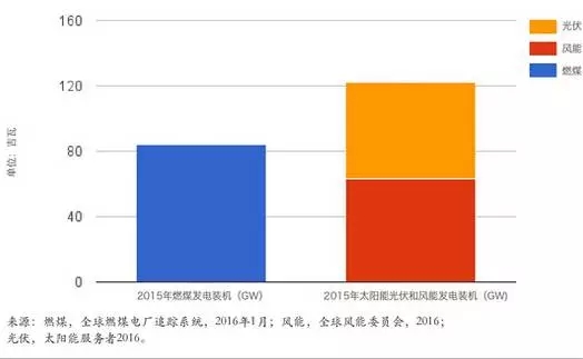 2015全球新增燃煤裝機(jī)、風(fēng)能和光伏裝機(jī)對(duì)比(吉瓦)