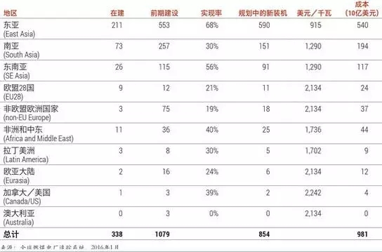 其后,綠色和平組織在其長(zhǎng)達(dá)82頁的報(bào)告《繁榮與衰落2016:追蹤全球燃煤發(fā)電廠》中表示:在世界范圍內(nèi),有338GW的燃煤發(fā)電裝機(jī)正在建設(shè),以及1086GW的裝機(jī)處在規(guī)劃的不同階段——相當(dāng)于1500個(gè)燃煤電廠。花在這些“并非必需”電廠上的投資接近1萬億美元(9810億美元)。