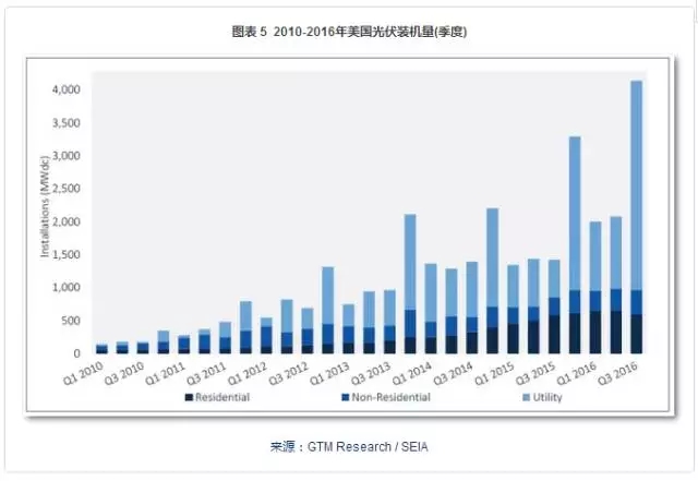 美國2016全年光伏裝機14.76GW,裝機量同比增長97%,其中公共事業(yè)裝機量起到了主要的拉動作用。