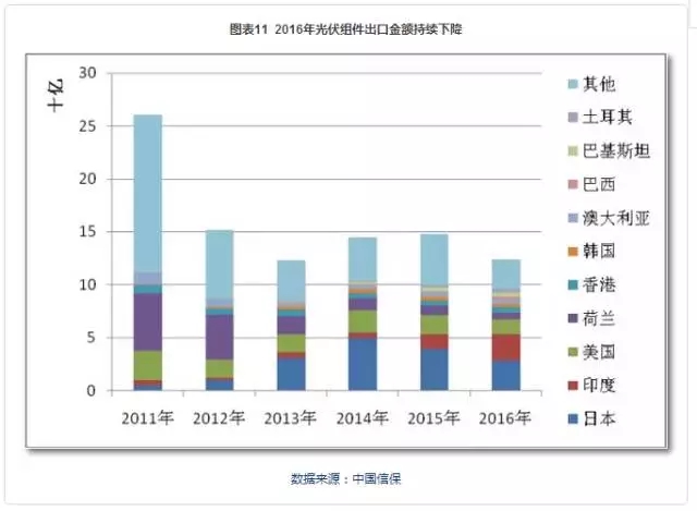 日本仍為我國光伏組件出口的第一大市場,但2016年,我國對日光伏組件出口金額28.34億美元,較2015年同比下滑26.80%。